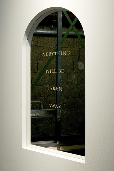 2004. Plexiglas wall corner insert engraved with gold leaf text, 24 " x 48" (61 cm x 121.9 cm). #08037.2. Photo credit: Andrej Glusgold. Collection of the Adrian Piper Research Archive Foundation Berlin. © APRA Foundation Berlin.